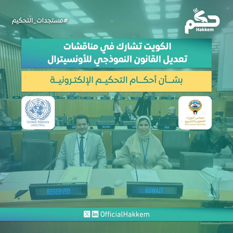 وقد ضم وفد دولة الكويت المشارك في أعمال الدورة المستشار وكيل الإدارة الأستاذة/ تهاني الرشيدي محامي الدولة الأستاذ/ عبد الله بوقريص. وتعكس هذه المشاركة اهتمام الكويت بمتابعة التطورات التشريعية الدولية ذات الصلة بالتحكيم التجاري، لا سيما في ظل التحول الرقمي في إجراءات تسوية المنازعات.