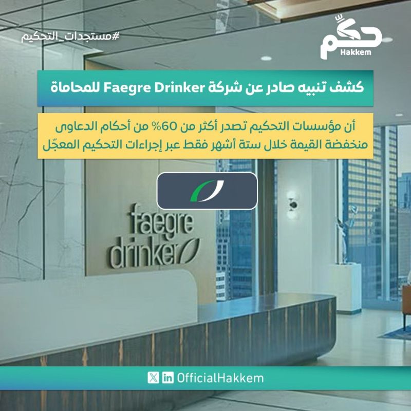 كشف تنبيه صادر عن شركة Faegre Drinker للمحاماة أن مؤسسات التحكيم تصدر أكثر من 60% من أحكام الدعاوى منخفضة القيمة خلال ستة أشهر فقط عبر إجراءات التحكيم المعجّل.